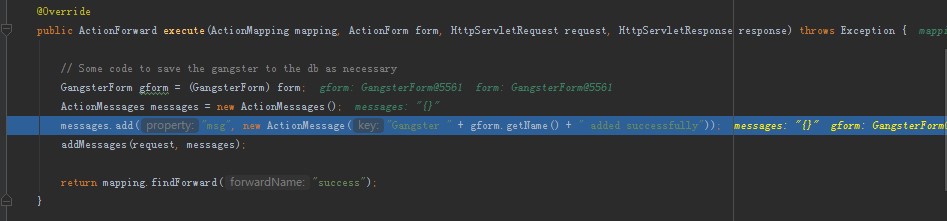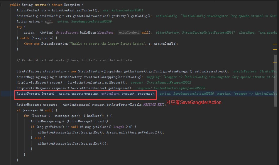 Struts1Action的execute方法代码如下,从红框中信息可以看出其实质是调用SaveGangsterAction.execute方法,然后再调用getText(msg.getKey()….)。