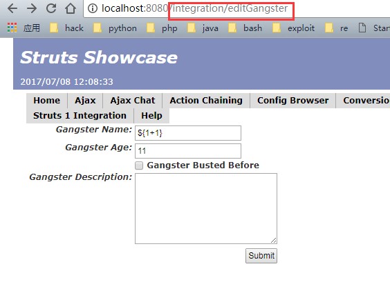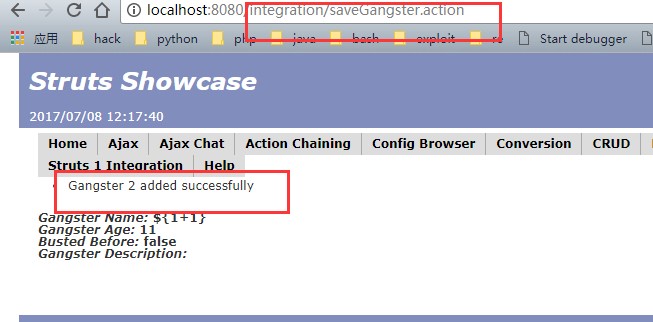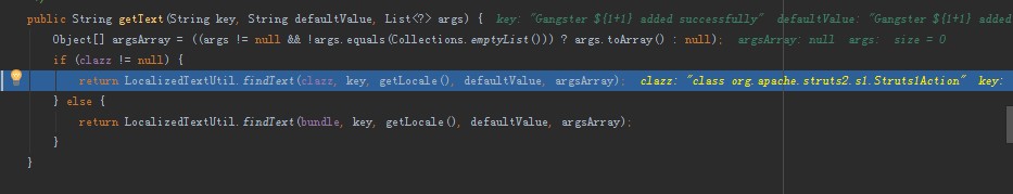 这里传入了${1+1},有毒参数已经带入,就差ognl表达式,继续回到Struts1Action类的execute方法下半部分,有getText()的入口,能清晰看到参数已经被污染,具体如下图: