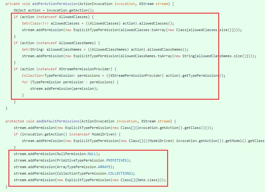 在官方的修复方案中主要就是将xml中的数据白名单化,把Collection和Map,一些基础类,时间类放在白名单中,这样就能阻止XStream反序列化的过程中带入一些有害类。