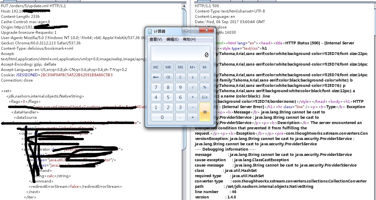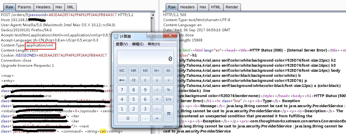 成功弹出计算器,这也就验证了我们的想法。同时通过两个不同poc的比较,我们也能发现一些端倪,Content-Type支持xml的几种格式,POST请求,PUT请求,GET请求甚至是自定义请求都是能触发漏洞,我们可以将poc中