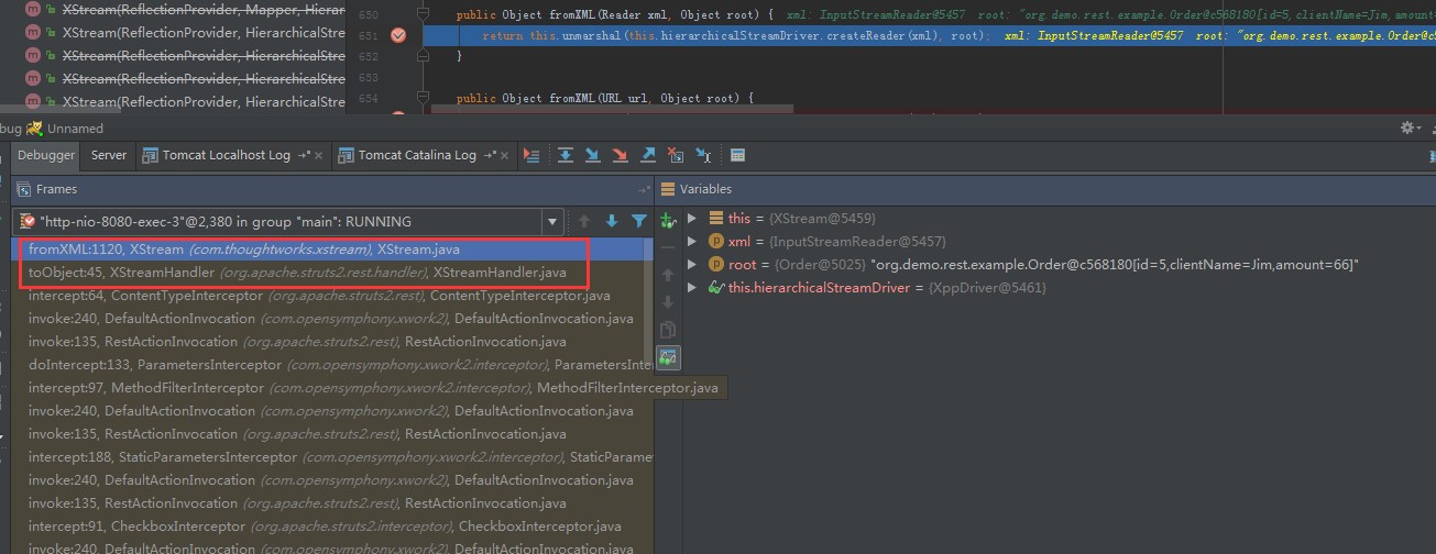 在XStreamHanler.toObject调用了XStream的fromXml,从而进入反序列化流程。