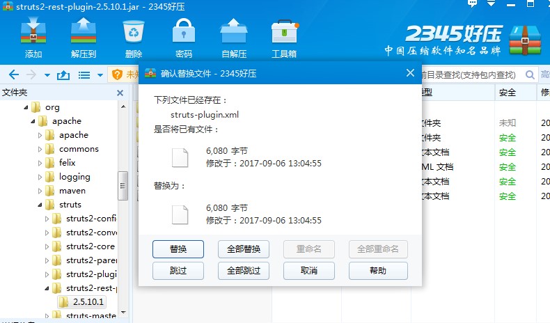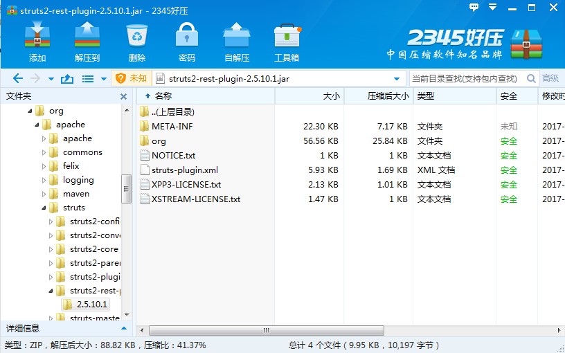 使用压缩工具打开对应的jar包,这里以struts2-rest-plugin-2.5.10.1.jar为例: