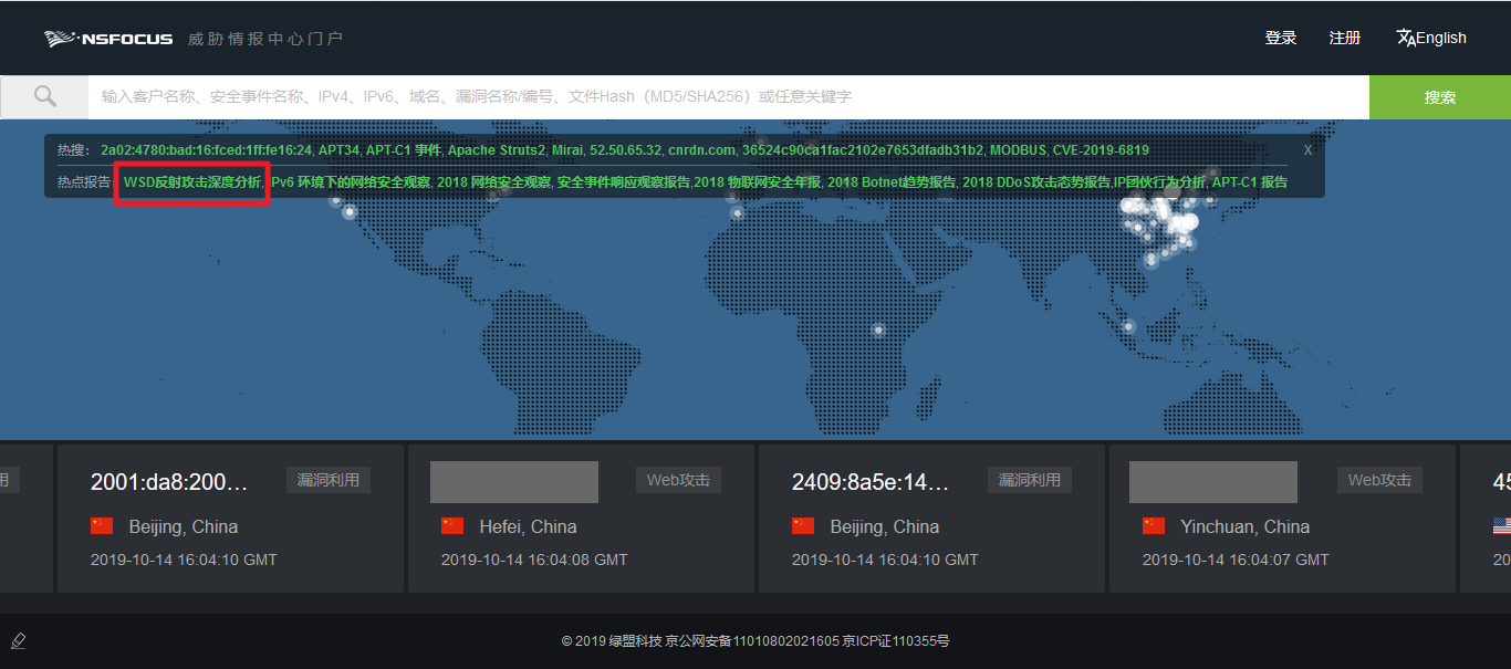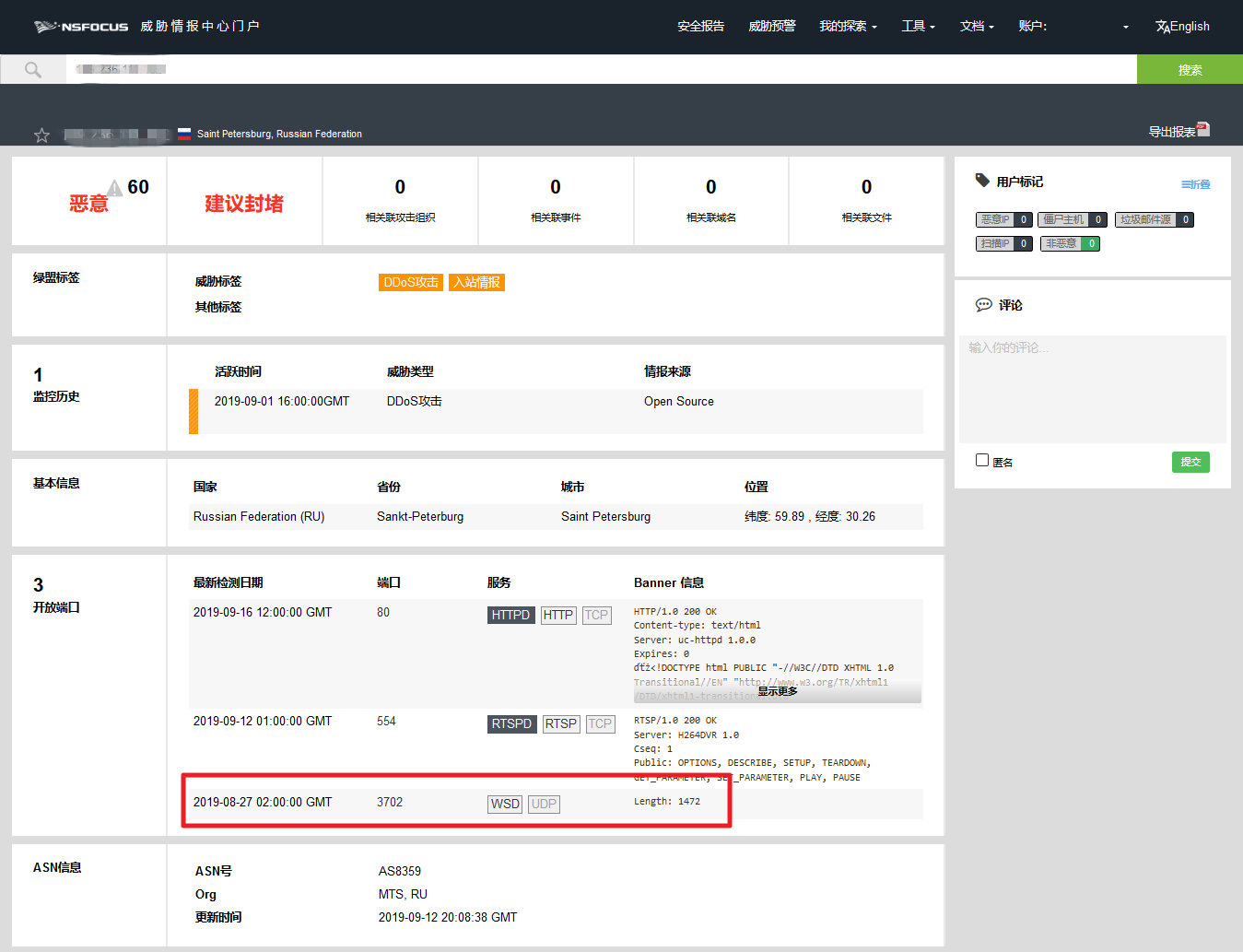 此外,绿盟威胁情报中心(NTI)一直支持对于WSD服务的检索,可提供最新WSD暴露资产情报并持续更新。