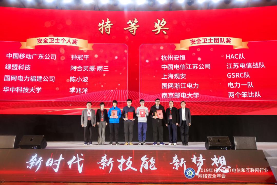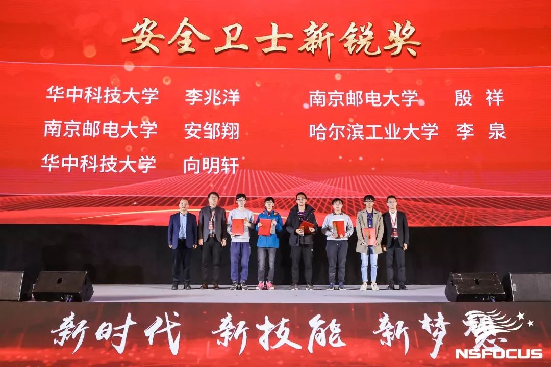 当今网络战愈演愈烈,而网络安全领域的战争归根到底是人才的竞争。网络安全专业人才是未来行业发展的生力军与储备力量,此次大赛特设学生组,有来自全国各高校的12支代表队参赛,很多人都是首次参与国家级赛事,通过此次竞赛的历练,与全国各地的选手切磋技艺,收获颇丰,最终来自华中科技大学、南京邮电大学、哈尔滨工业大学三所高校的五名同学荣获安全卫士新锐奖,绿盟科技副总裁陈果为获奖选手颁奖。
