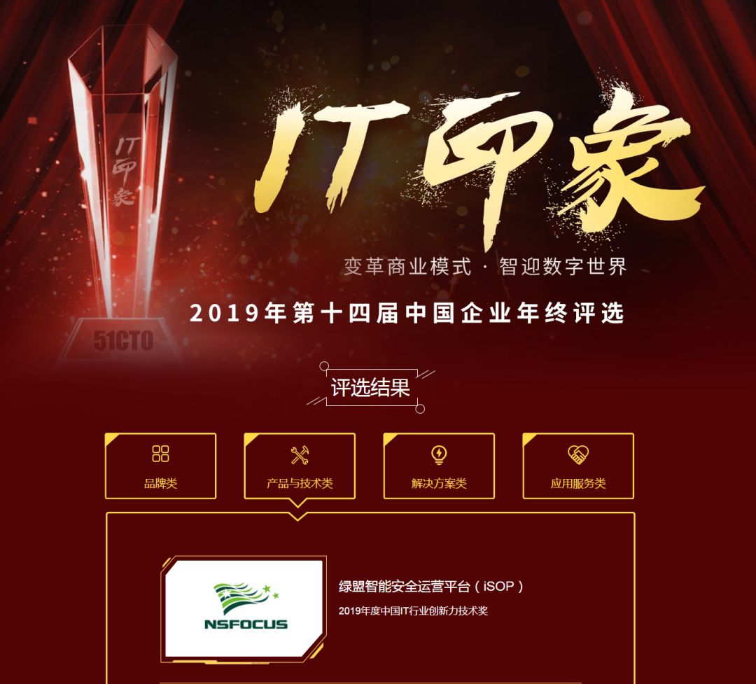 12月19日,由51CTO主办的《中国企业“IT印象·变革商业模式,智迎数字世界”年终评选》暨2019年第十四届中国企业年终评选获奖结果正式发布。绿盟智能安全运营平台经过激烈角逐脱颖而出,荣获“2019年度中国IT行业创新力技术奖”。