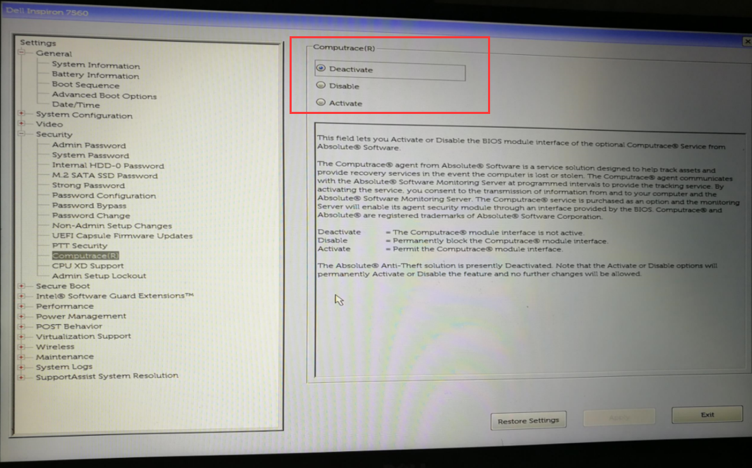 Dell品牌计算机重启后按F2即可计入BIOS,点开左边Serurity选项,查看其子选项Computrace,如果选项为Activate则表示Compurtace已经被激活,Deactive表示未激活,Disable表是禁用。其它品牌请在计算机BIOS菜单中逐一筛查。