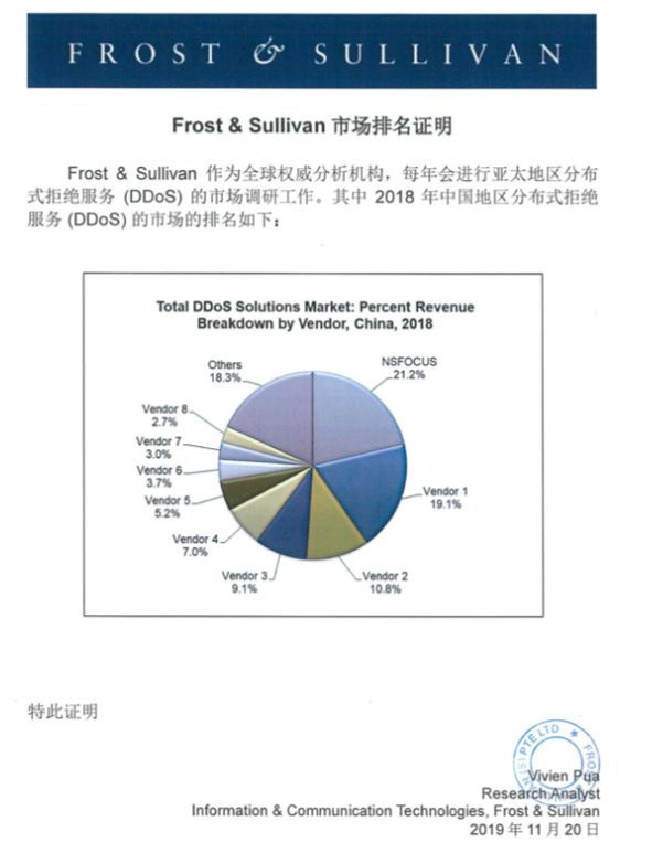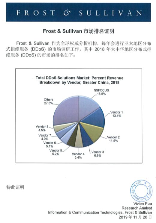 根据第三方分析机构Frost&Sullivan最新发布的《DDoS China Market Ranking Statemet, CY2018》和《DDoS Greater China Market Ranking Statement,CY2018》两份市场材料数据显示:绿盟抗拒绝服务系统ADS以市场占有率21.2%和15.5%的份额,名列大中华区及中国地区第一。这已经是绿盟抗拒绝服务系统ADS连续五年取得市场排名第一的好成绩。
