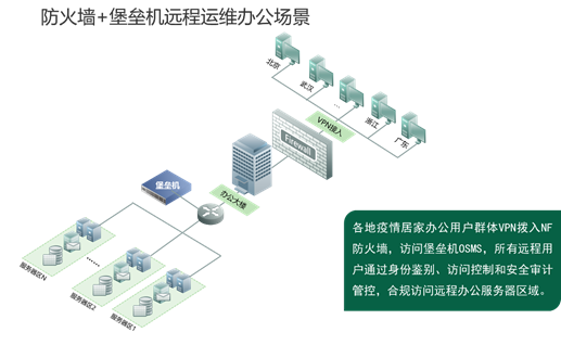 防火墙SSL VPN和堡垒机分别部署在核心出口和业务侧旁路,居家办公用户群体VPN拨入NF防火墙,访问堡垒机,所有远程用户通过身份鉴别、访问控制和安全审计管控,合规访问远程办公服务器区域。此外可扩展数据库审计、终端安全等功能,加强审计能力,满足业务服务器终端的安全连接。