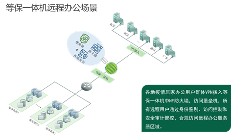 等保一体机以一机交付的形式,集成VPN和堡垒机,居家办公用户群体VPN拨入NF防火墙,访问堡垒机,所有远程用户通过身份鉴别、访问控制和安全审计管控,合规访问远程办公服务器区域。此外可扩展数据库审计、终端安全等功能,加强审计能力,满足业务服务器终端的安全连接。