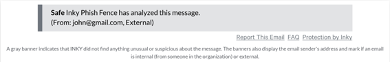 INKY Phish Fence过滤每一封电子邮件。在最终呈现给用户的邮件中,该系统会在每一封邮件的顶部加上一个横幅(banner),来对邮件的安全性进行说明。