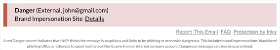 不同风险程度的邮件用不同的颜色标识。其中,灰色横幅用于标识安全的邮件,黄色横幅用于标识谨慎打开的邮件,红色横幅用于标识危险邮件。在黄色和红色标识中点击“Details”链接可以进一步查看对邮件的描述。这些信息可以让用户了解他们的收件箱中存在的威胁。另外,这些信息可以让用户学习到更多的钓鱼邮件相关的知识,这往往比钓鱼邮件模拟测试更加有效。横幅中的“Report This Email”链接允许终端用户报告来自任何终端设备的有问题的电子邮件,而不需要特殊的客户端软件。INKY甚至整合了自然语言处理(NLP)算法来识别敏感内容,如电汇或发票付款请求、密码相关的电子邮件等,并在横幅中标注客户可配置的策略来对用户进行指导。