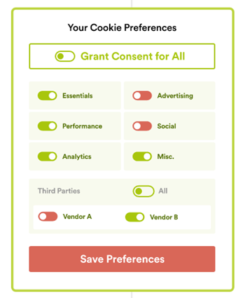 Consent Lifecycle(许可生命周期管理)产品可应用与网站的Cookie的数据收集,征求用户的同意,对标多个GDPR、CCPA等法规的数据处理与利用的公开透明原则。首先,提供服务的企业需在自身网站中部署Consent Lifecycle相关插件,如下图所示,它提供了用户授权设置的一个窗口。然后,用户可在设置盘中授权网站的Cookie信息授权应用于那些目的,比如数据分析、广告推荐、社交发现,提供给第三方组织C1企业或C2企业等。那么,如果用户没有授权Cookie信息用于广告,而服务企业却在后台的广告推荐系统利用了该Cookie信息,那么Consent Lifecycle将监控到这一异常行为,在后台触发告警行为,以通知企业停止违反法规的风险行为。