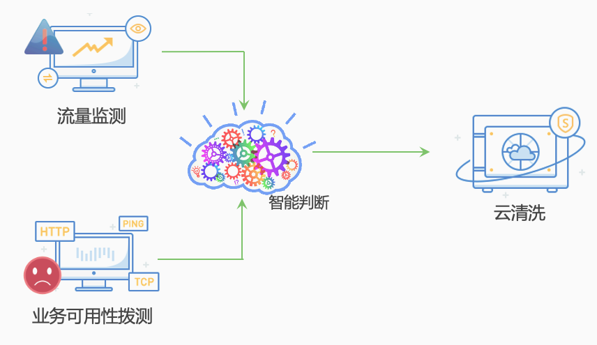 1、为进一步降低误报,DDoS监测与防护平台还采用业内先进的基于业务状态与流量监测告警双重结合、智能判断的自动清洗方式,通过不同类型告警权重,综合智能判断分析后进行告警,从而解决单一探测误报导致的乱牵引、分钟级拨测周期、多种协议探测(包括HTTP/HTTPS、TCP、ICMP、DNS)的问题,避免影响客户业务,提高服务质量与运维效率。