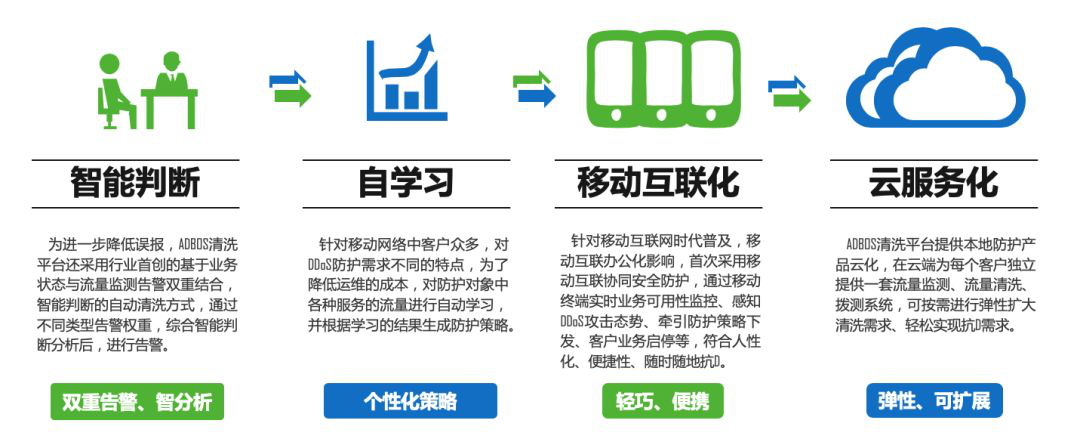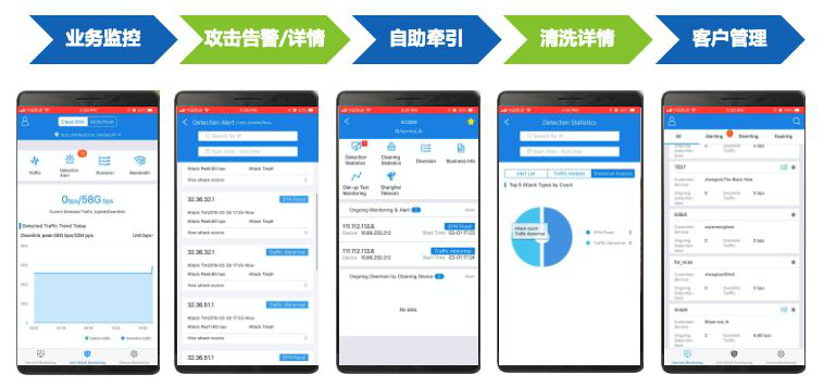 3、针对移动互联网时代的普及和移动互联办公化影响,ADBOS采用了移动互联协同安全防护,通过移动终端实时业务可用性监控、感知DDoS攻击态势、牵引防护策略下发、客户业务启停等功能,更加人性化、便捷化的随时随地抗D。