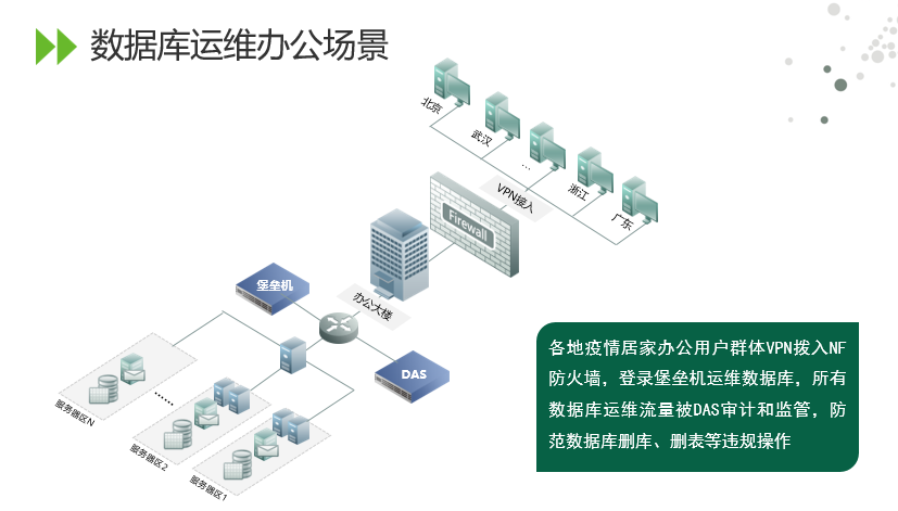 在企业核心出口上串联部署防火墙,旁路部署堡垒机和数据库审计DAS。可分别在防火墙和堡垒机上注册唯一访问身份标识,设置访问控制权限和审计访问行为。各地疫情居家办公用户群体VPN拨入NF防火墙,登录堡垒机OSMS运维数据库,所有数据库运维流量被DAS审计和监管,防范数据库运维过程中删库、删表等违规操作。
