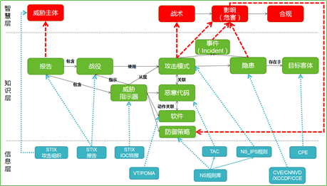 针对信息安全领域知识图谱构建的两个关键要素,构建了威胁元语言模型对威胁知识的结构化描述,包括概念、实体、属性的定义以及知识关系的定义。研究中依据STIX2.0以及领域专家知识,构建三层安全知识图谱,如下图所示。知识图谱辅助安全事件分析、安全合规标准、APT追踪溯源等实际业务场景所需的数据表示和语义关系。