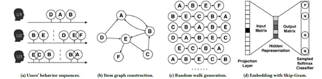 首先图2.2(a)中是用户行为,从知识图谱的角度可以抽象成图2.2(b)中的图模型。在当前推荐系统和安全领域都比较常见,而对于抽象的图模型如何利用图嵌入技术处理呢?首先,DeepWalk[1,2,3]将随机游走得到的节点序列当做句子,从截断的随机游走序列中得到网络的部分信息,再经过部分信息来学习节点的潜在表示。该方法借助语言建模word2vec中的一个模型,Skip-gram来学习节点的向量表示。将网络中的节点模拟为语言模型中的单词,而节点的序列(可由随机游走得到)模拟为语言中的句子,作为Skip-gram的输入。可以看出在表示图模型中图嵌入技术有天然的优势,因为它本身把多维图模型映射到同一向量空间,顶点之间的关联关系可以通过顶点向量的相似度计算,任一顶点与其他顶点的潜在关系都可以很快的计算出来。