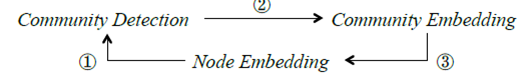 一方面,节点嵌入可以帮助改进社区检测,从而输出良好的社区以适应更好的社区嵌入,另一方面,社区嵌入可以通过引入A Community-aware 高阶近似性来优化节点嵌入。在这指导下,提出了一个新的社区嵌入框架,如图2.3所示。
