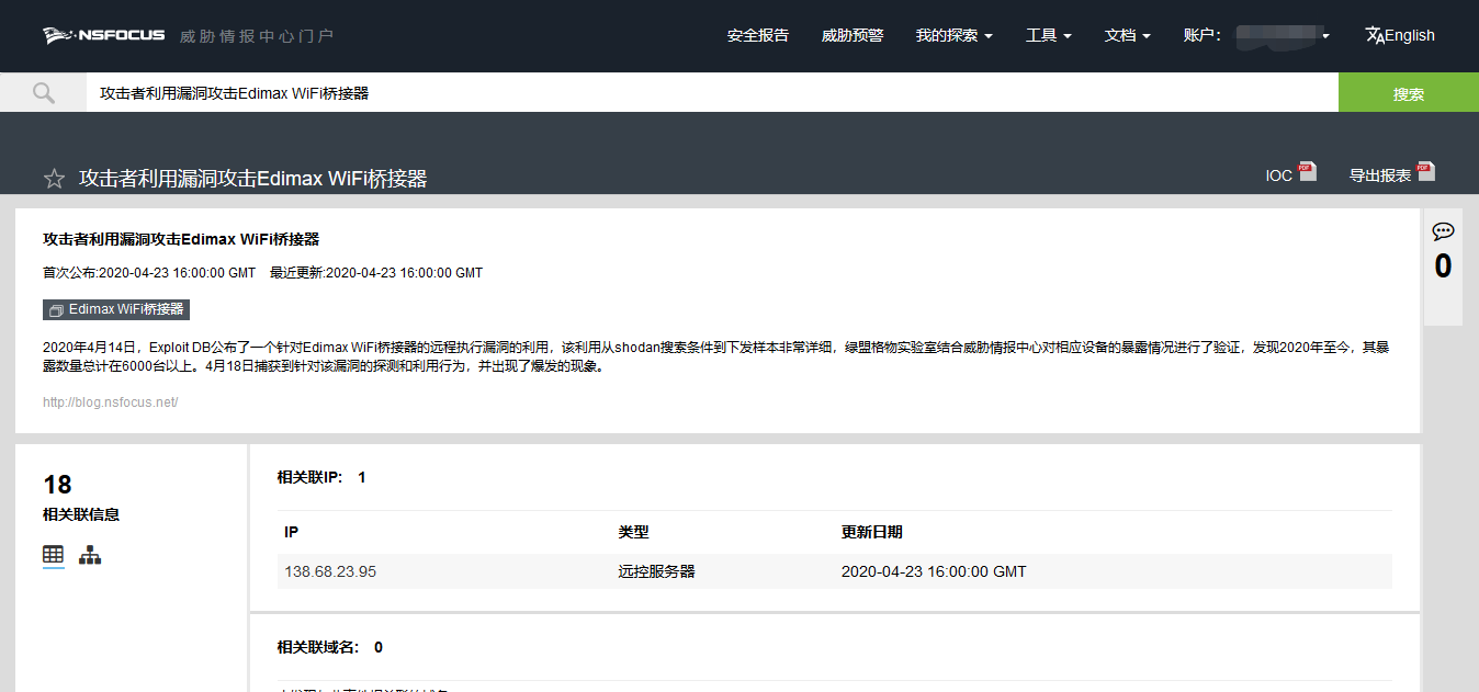 攻击者利用漏洞攻击Edimax WiFi桥接器,绿盟威胁情报中心已支持相关检测