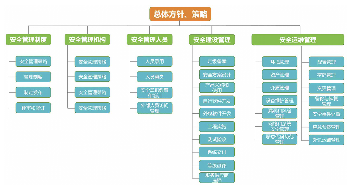 从安全策略、管理制度、管理机构、人员管理、安全建设管理和安全运维管理等方面分别设计。重点内容包括安全管理机构的组建,安全策略、管理制度、操作规程、记录表单等安全管理制度体系的补充和完善,安全相关人员的录用、培训、授权和离岗管理,围绕信息系统全生命周期安全的安全建设管理和安全运维管理。