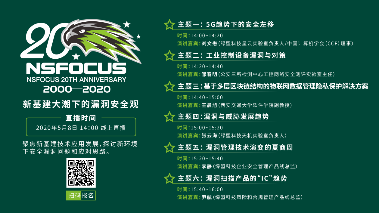 5月8日,绿盟科技主办了题为“新基建大潮下的漏洞安全观”的直播论坛,线上解读新基建背景下隐藏的各类漏洞风险,深度剖析“新基建”风口下的安全挑战,邀请多位专家围绕国家政策支持、技术创新、生态建设和产品升级等层面,分享新基建背景下的漏洞安全发展趋势及研究成果,并发布了基于IC化理念的绿盟远程安全评估系统全新版本。