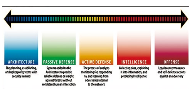 随后,2015年,SANS提出“网络安全的滑动标尺模型”,为企业安全建设提供了宏观上的指导和建议。滑动标尺模型从左到右,是企业逐步应对更高级网络威胁的过程,其中情报是继架构安全、被动防御、主动防御之后的进阶阶段。