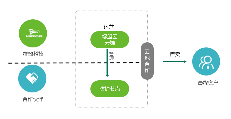 绿盟科技与合作伙伴共建安全能力防护节点,由云端的绿盟云平台进行统一管理和运营。合作伙伴只需要提供基础设施(机房、服务器、带宽等)用于部署防护节点,并进行SaaS安全产品售卖即可。