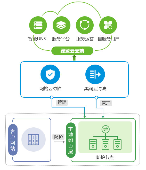 绿盟科技提出云地合作模式的解决方案,提供了网站安全云防护服务,在运营商机房部署服务的防护节点,云端进行统一管理和运营。