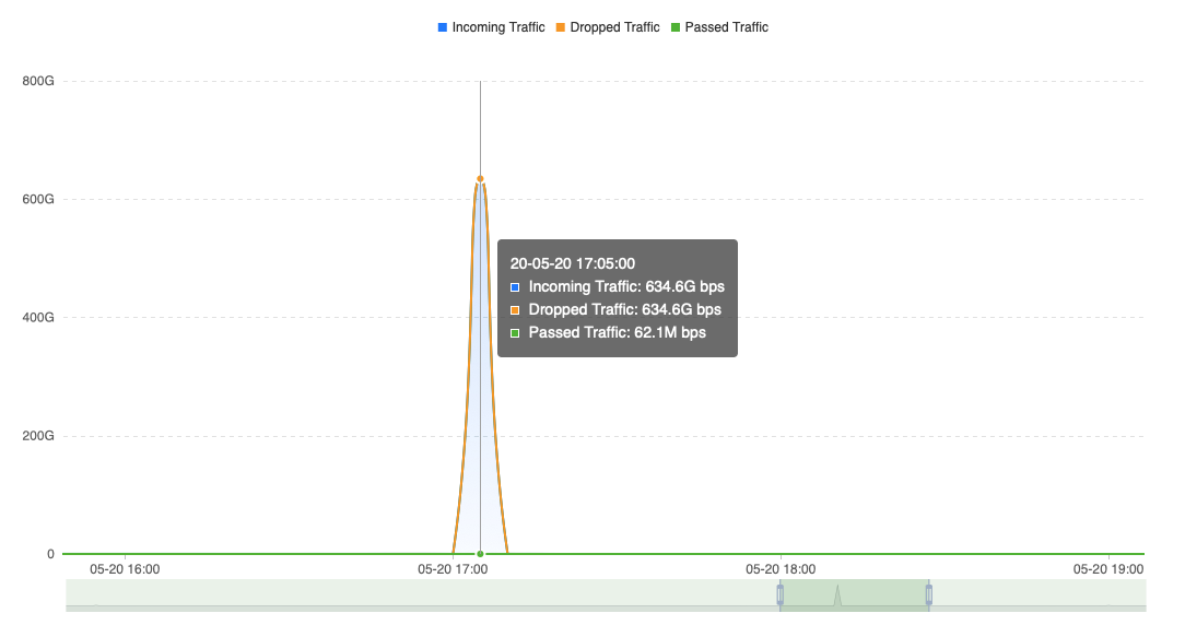 5月20日下午17点,绿盟科技SOC在全球监控中心发现了一股异常流量提示,一个中国香港客户的IP正在遭受攻击。绿盟科技安全专家迅速响应,立即与客户进行沟通,与此同时,入向流量值突然陡增,绿盟科技全球清洗中心立刻进入了战备状态。持续进入的DDoS攻击流量,不久就将攻击最大峰值升级到了634.6G,这也是今年绿盟科技客户遭受到的最大流量的攻击。