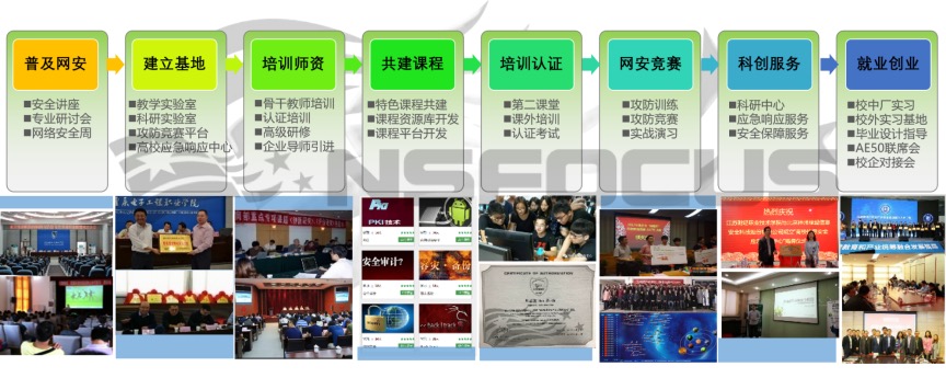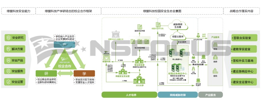 基于此,绿盟科技提出“普及网安”、“建立基地”、“培训师资”、“共建课程”、“培训认证”、“网安竞赛”、“科创服务”、“就业创业”八大措施,系统地为产学研工作进行支撑。