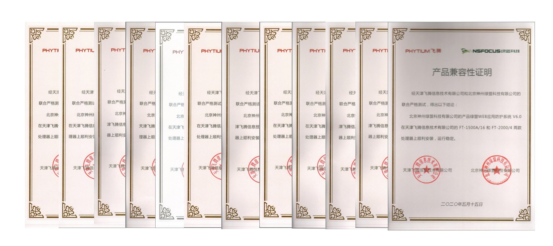 目前,绿盟科技信创系列产品已经与飞腾FT1500A/16、飞腾FT2000/4、华为鲲鹏916、鲲鹏920、兆芯C4600、申威1621等CPU进行全面适配。