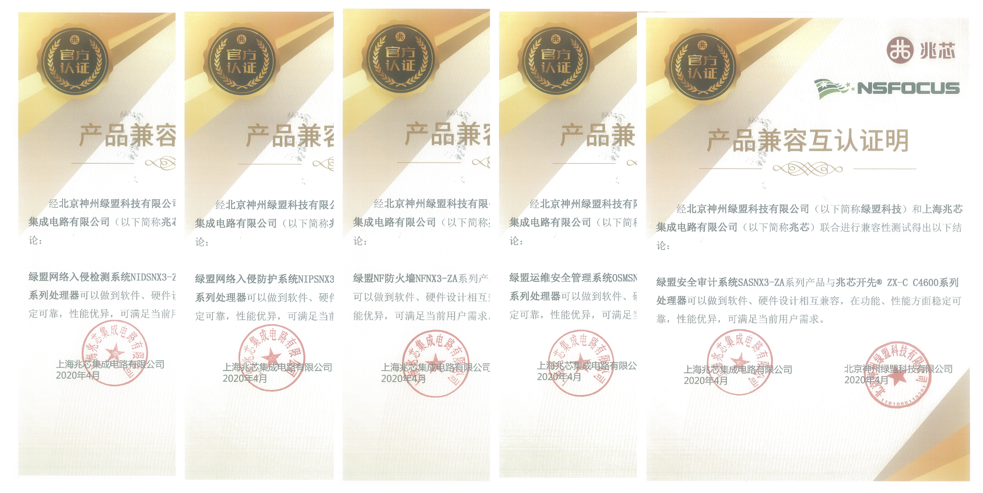绿盟科技与兆芯CPU完成兼容性测试的产品包括:绿盟NF防火墙、绿盟安全审计系统、绿盟网络入侵防护系统、绿盟网络入侵检测系统、绿盟运维安全管理系统。