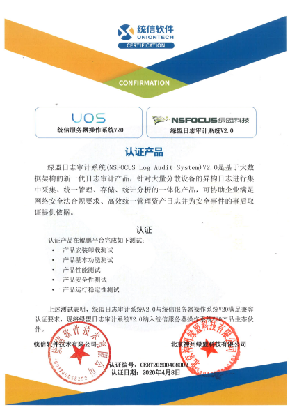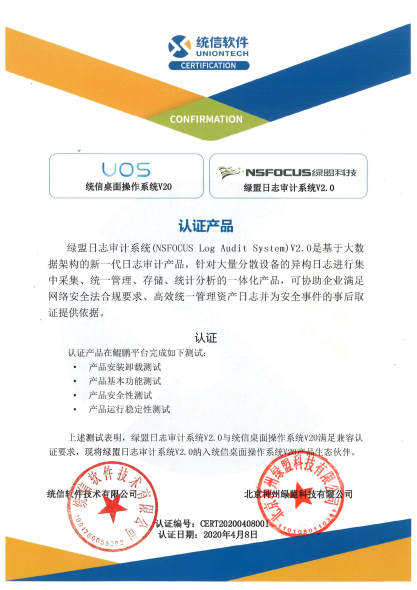绿盟科技与统信操作系统完成兼容性测试的产品包括:绿盟日志审计系统(统信服务器操作系统和统信桌面操作系统)。