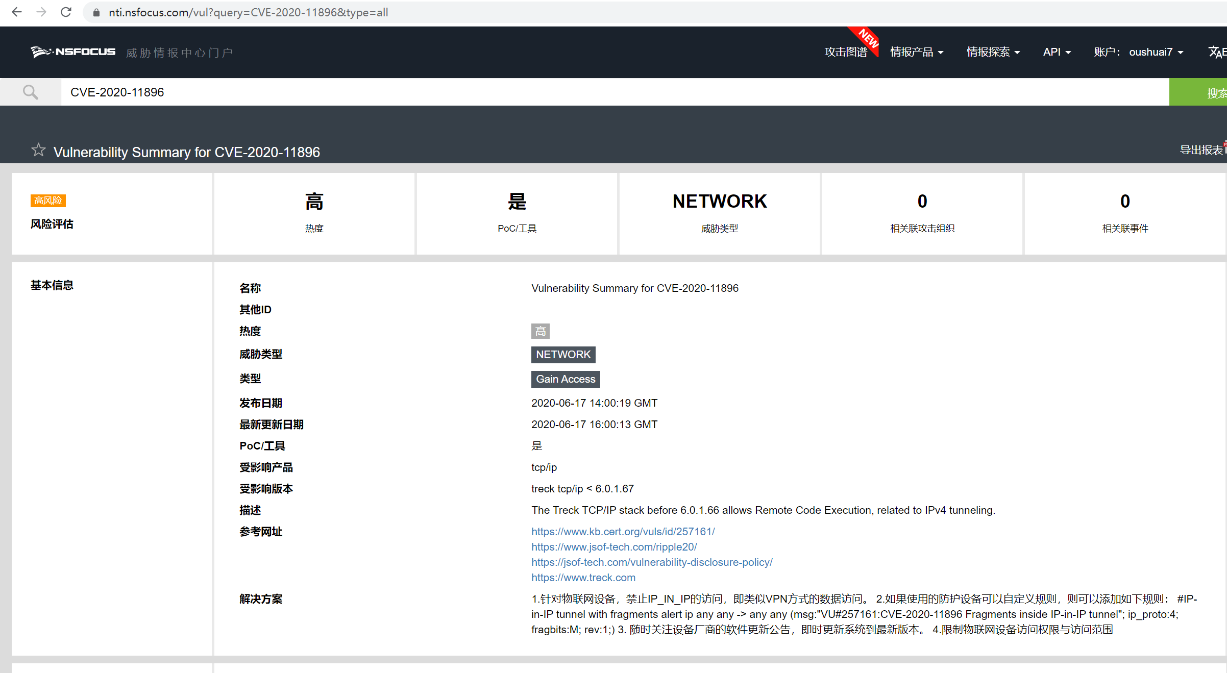 绿盟科技远程安全评估系统(RSAS)已具备针对Treck协议的检测能力,请有部署设备的用户升级至最新版本使用。