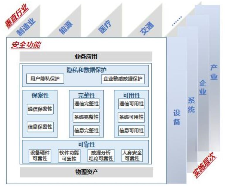 为解决工业互联网面临的网络攻击等新型风险,确保工业互联网健康有序发展,我国工业互联网安全功能框架2.0充分考虑了信息安全、功能安全和物理安全,聚焦工业互联网安全所具备的主要特征,包括可靠性、保密性、完整性、可用性、隐私和数据保护,如图 1所示。