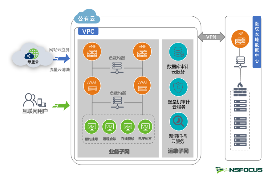 绿盟“互联网+医疗健康”安全解决方案结合业务应用场景和安全需求,从公有云VPC边界安全、VPC安全运维和安全SaaS服务三个方面设计: