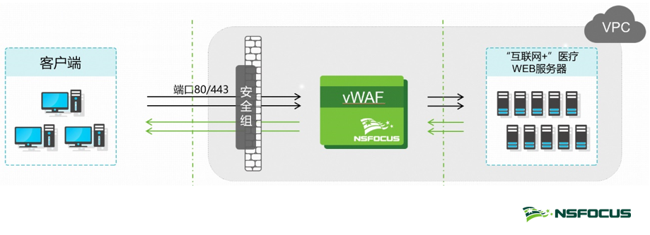 在VPC边界,通过部署虚拟化的下一代防火墙和WEB应用防火墙,实现对“互联网+”医疗应用的访问控制和网络攻击防护。