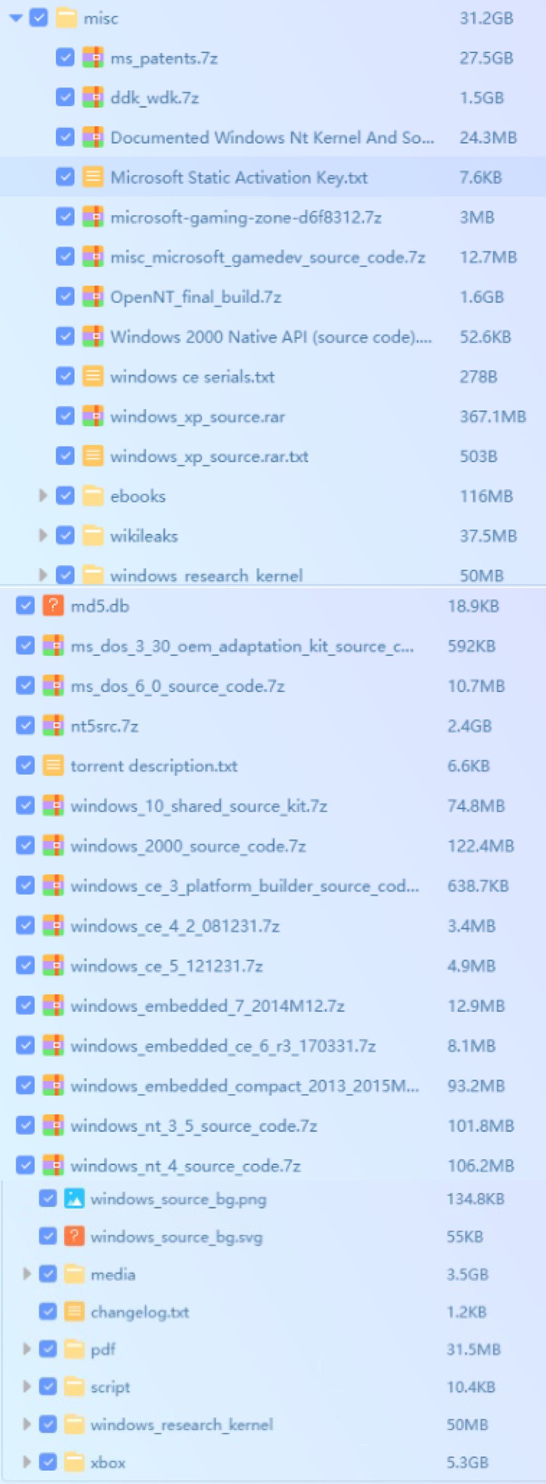 下载的资料中除了本次引人注目的Windows XP和Windows Server 2003的源代码,以及Windows NT 3.5、Windows NT 4.0、Xbox等相关的源代码,还包含了大量Windows相关的新闻和视频内容。