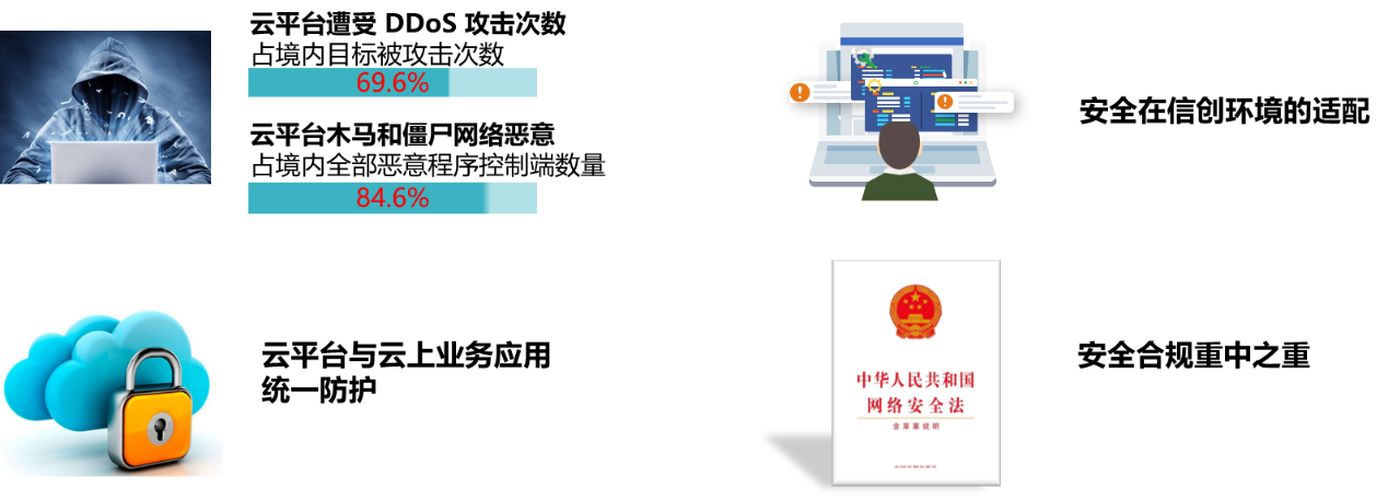 随着信创云的大量使用,新的安全风险和需求日益凸显。根据网络攻击数量统计显示,云平台被攻击占比已经达到70%,已经成为网络安全重灾区。与此同时,安全设备需要适配新的信创环境,安全方案需满足信创云平台自身及云上业务应用统一防护的目的,安全能力需满足合规性要求,为业务的安全上云带来诸多挑战。为解决上述问题,绿盟科技推出了“信创云安全服务平台”作为专门解决信创云安全保护的解决方案。