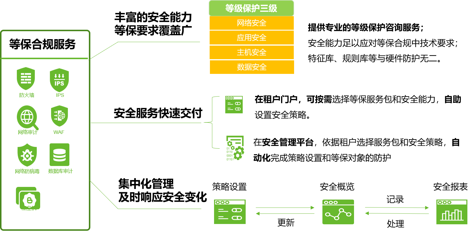 该方案基于“软件定义安全“的架构进行设计,实现安全能力灵活调度,满足不同用户个性化的安全防护需求,安全能力深度适配信创云环境,为云平台自身和云上应用提供了更为全面的防护,按照国家等保合规的技术要求,提供丰富的等保安全能力,并可自动化交付,以图形化的方式展示安全趋势,威胁事件等安全信息,满足云平台运营者和租户的共同诉求。