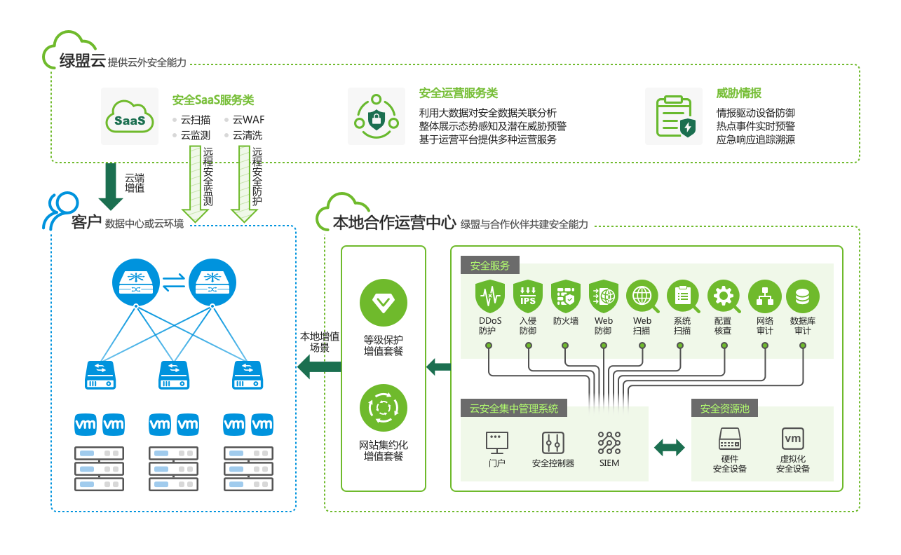 作为云安全服务商,绿盟科技对端点、网络、云服务平台积累了的丰富运营经验,同时基于多年对市场需求及行业趋势的深刻洞察,并充分考虑云计算的特点和优势、最新的安全防护技术研究进展,推出安全增值运营服务,提供业务运营、技术运营的一体化智能安全运营整体方案,协助合作伙伴建设具有竞争力的安全能力池,构建主动、动态、自适应的弹性防御体系,结合绿盟科技多年安全SaaS服务的经验,打造可增值的服务管理体系。