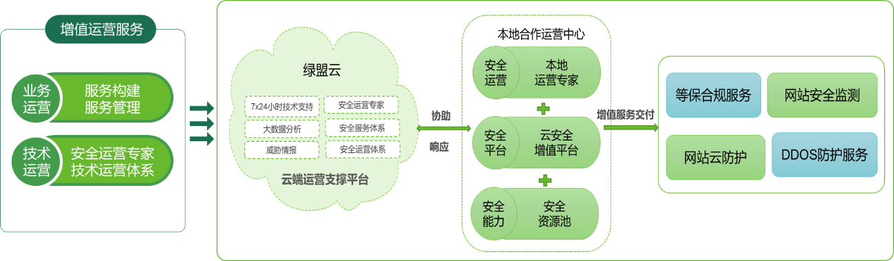 与客户共同建设本地安全运营中心提供安全服务能力,由云端运营、平台专家、本地驻场等多种安全运营服务模式与本地运营中心客户协同运营,为最终客户提供从安全问题咨询,安全服务组合推荐,服务开通策略调整,到最终持续运营交付的全方位安全服务。
