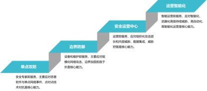 对风险的认知的演进,决定了安全运营认知的方向。整体来看,安全运营技术和产业经历了单点攻防、边界防御、安全运营中心的发展历程,并最终向运营智能化的方向持续演进。
