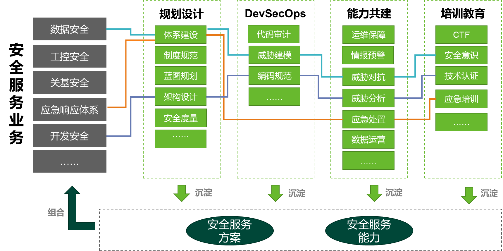 早期安全服务常作为验证手段,检验企业安全建设的功能和效果,呈现出“哪儿漏补哪儿”的局面,使企业始终处于被动性响应的状态。而安全服务相较于安全产品,更应是要覆盖安全建设全周期的,涉及规划、建设和运行各阶段。在企业安全建设初期,引入安全规划设计能力,通过服务指导安全建设,融入安全服务建设思路,前移企业安全保障能力,更加精准的运用安全产品,使其能效最大化;同时,注入整体规划、运营维度的视角,整体促进企业安全建设发展。