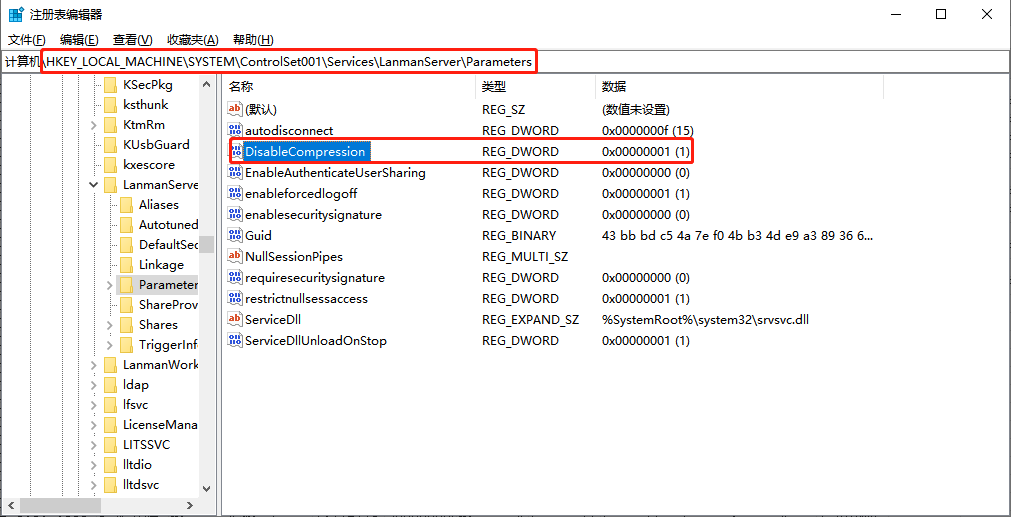 在 “HKLM\SYSTEM\CurrentControlSet\Services\LanmanServer\Parameters”目录中添加一个DWORD类型的注册表项DisableCompression ,数值为1。