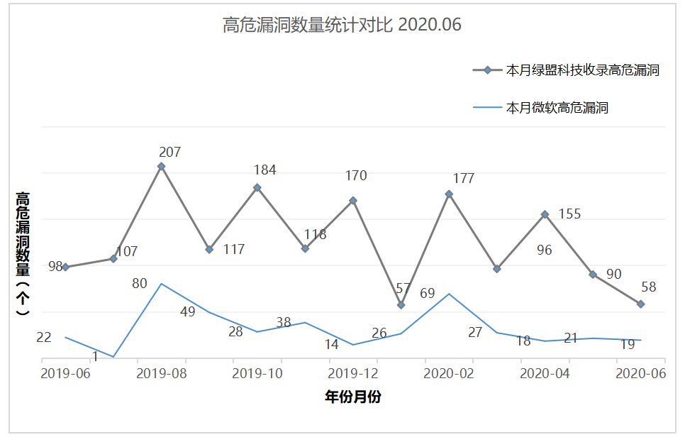 2020年06月绿盟科技安全漏洞库共收录177漏洞, 其中高危漏洞58个,微软高危漏洞19个。