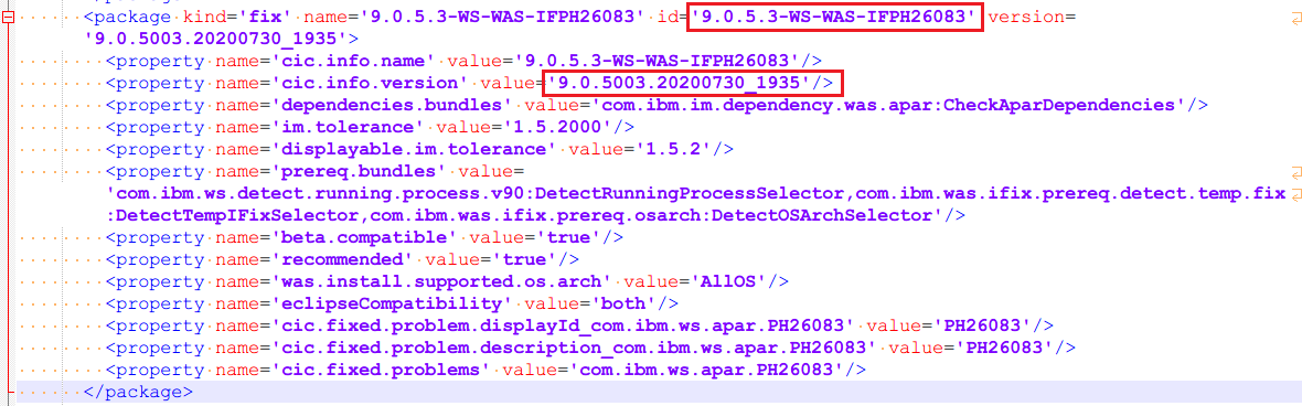 用户也可通过查看Installation Manager目录下的installed.xml文件,搜索PH26083检查当前是否安装补丁,若存在PH26083补丁信息,则当前不受漏洞影响。