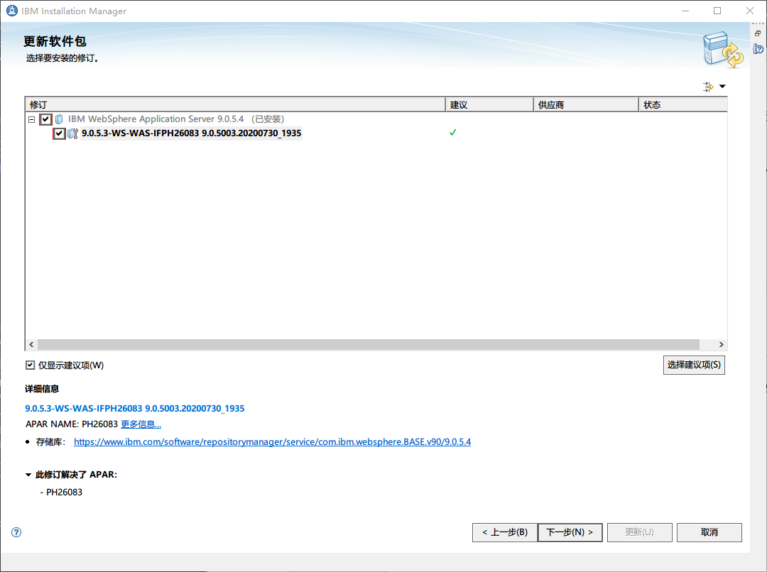 相关用户可通过IBM Installation Manager进行升级,根据提示进行版本更新、安装补丁PH26083。