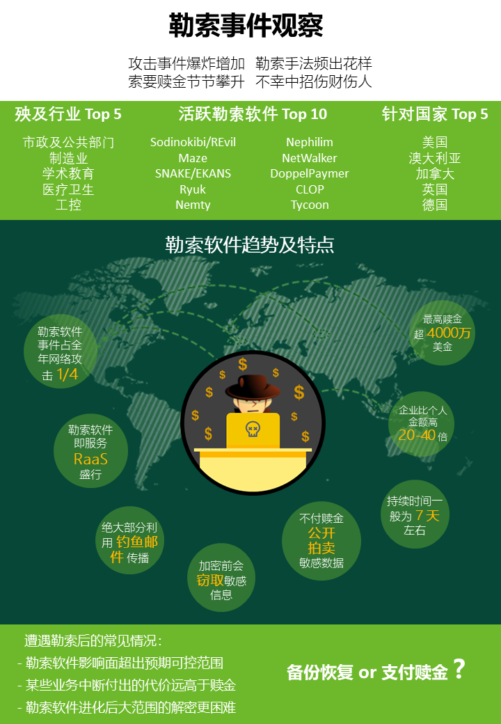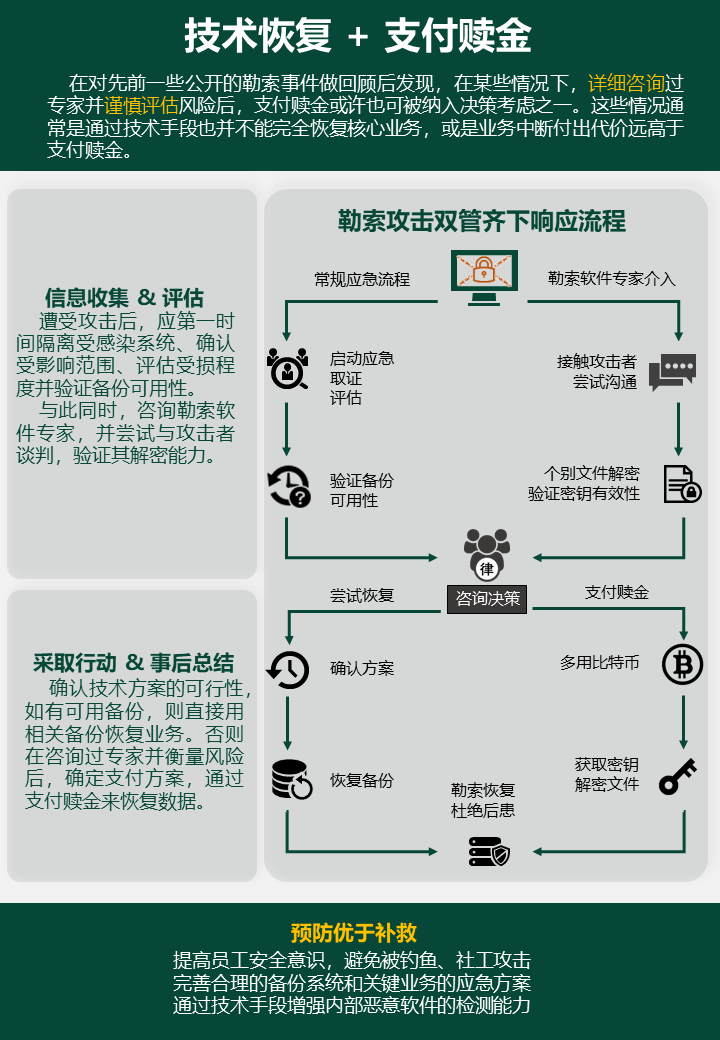 在对一些公开的勒索事件做回顾后发现,在某些情况下,详细咨询过专家并谨慎评估风险后,支付赎金或许也可被纳入决策考虑之一。这些情况通常是通过技术手段也并不能完全恢复核心业务,或是业务中断付出代价远高于支付赎金。