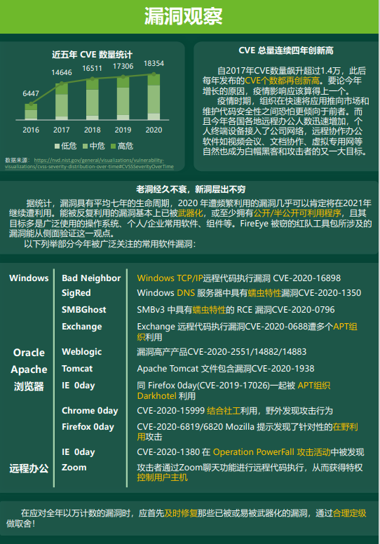 在绿盟科技威胁响应中心联合绿盟科技格物实验室发布《2020互联网安全事件观察报告》中指出,2020年安全事件主要有如下几类:漏洞类、勒索软件、信息泄露、 工控攻击事件及恶意软件。个人及企业对于高危漏洞的关注程度逐年增高,这些漏洞所能造成的直接影响已经较早些年大大降低。不过即便修复了漏洞也不能高枕无忧,有几类攻击已活跃多年,它们产生的影响能渗透到生产生活的各个方面。